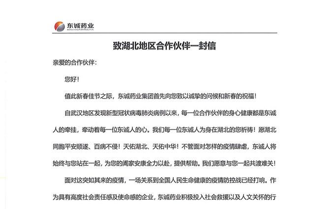 親愛的合作伙伴:您好!值此新春佳節(jié)之際,東誠藥業(yè)集團(tuán)首先向您致以誠摯的問候和新春的祝福!自武漢地區(qū)發(fā)現(xiàn)新型冠狀病毒肺炎病例以來,每一位合作伙伴的身心健康...